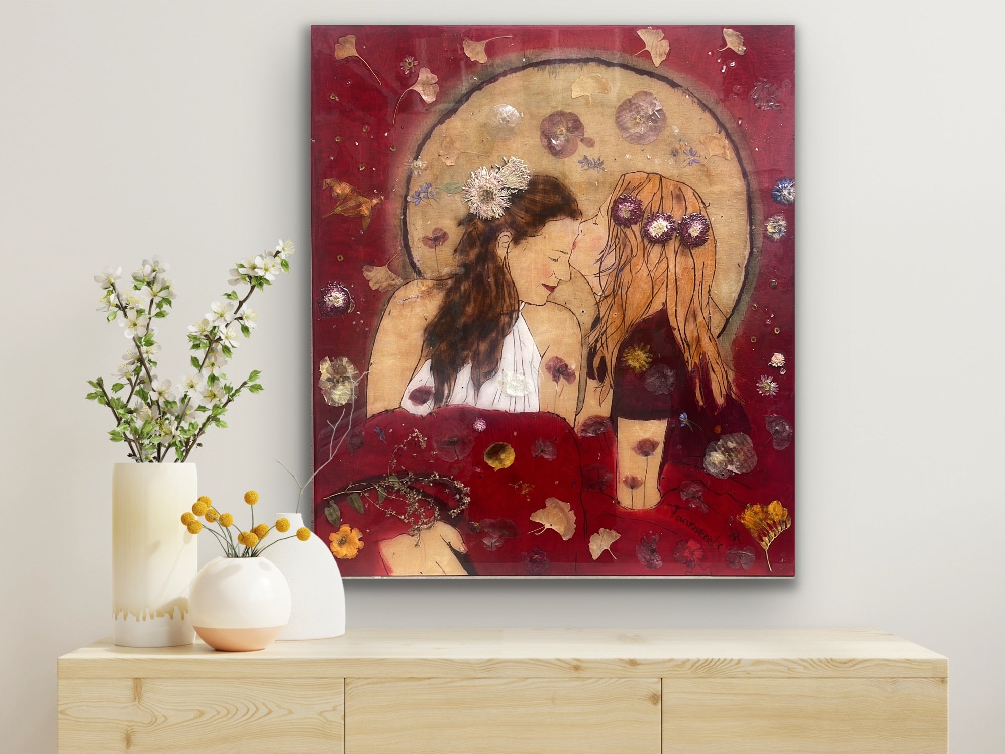 Original created with pyrography and blossoms embedded in epoxy on wood – reproduced as a fine art canvas print