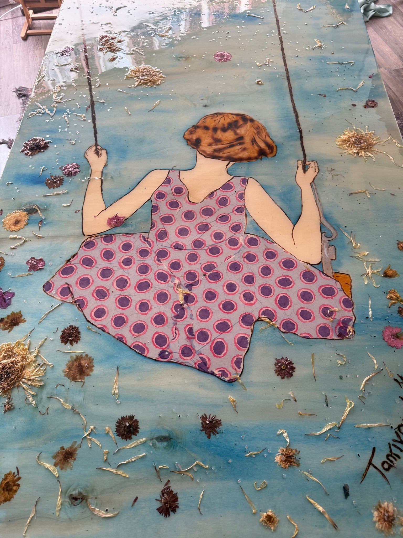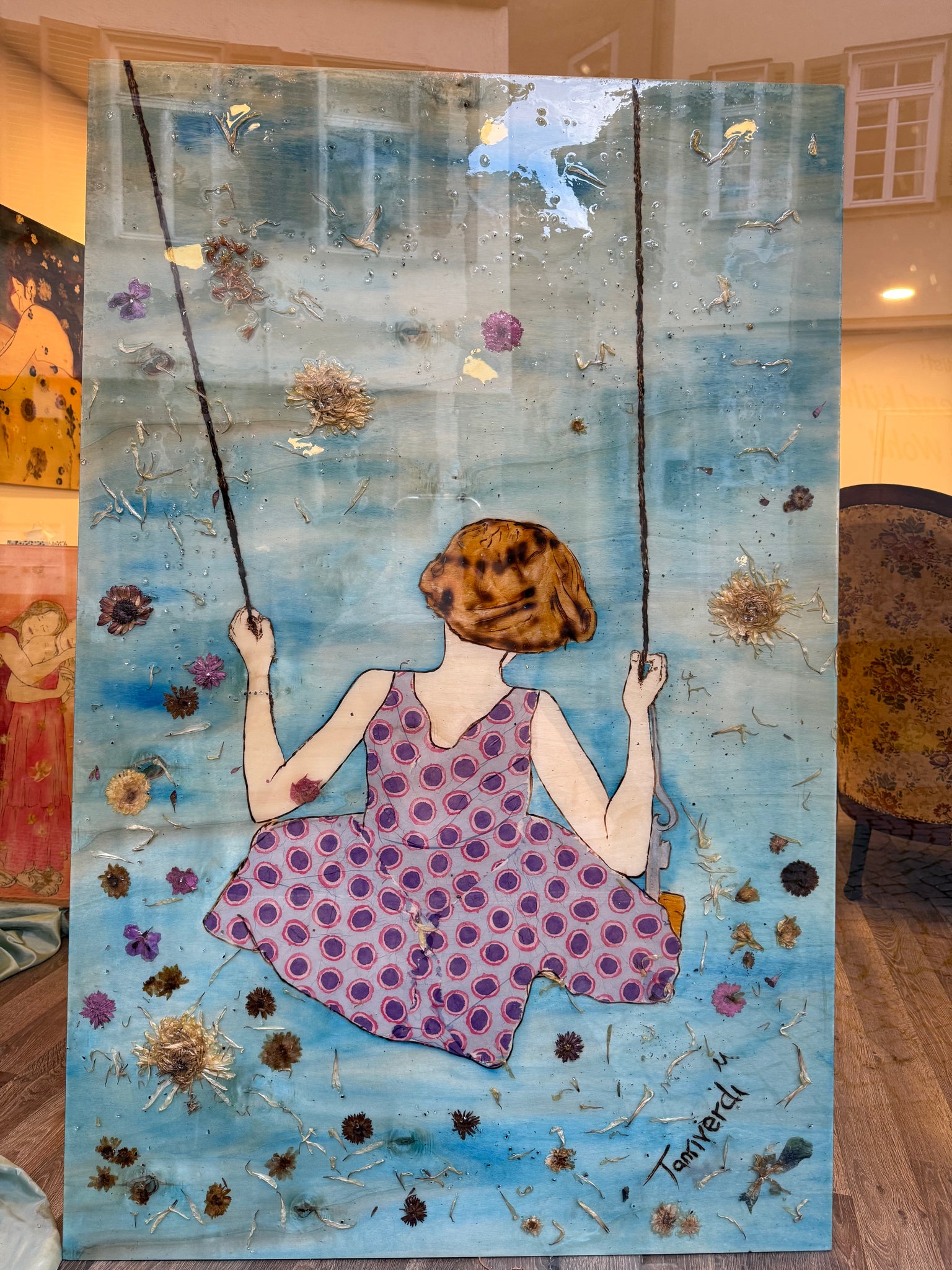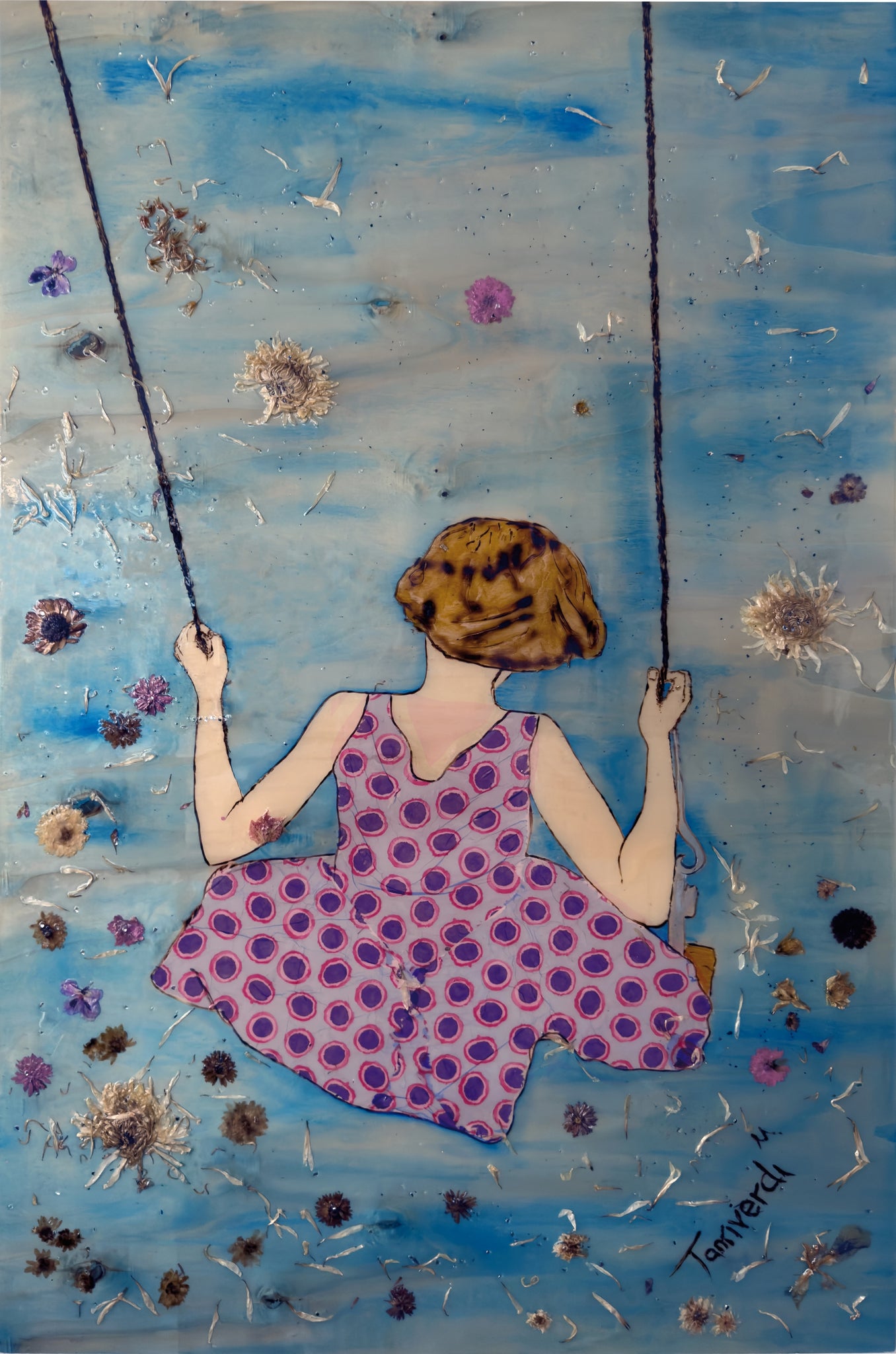 Swingtime – original mixed media artwork on wood by Mehlika Tanriverdi, showing a woman from behind sitting on a swing, surrounded by real dried flowers on a blue background.